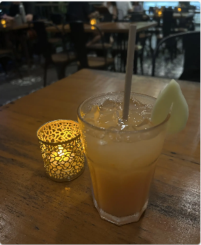 まずは、このお店おすすめの生姜、トロピカルフルーツ、オレンジ、ハチミツ入りのソフトドリンクをオーダー。