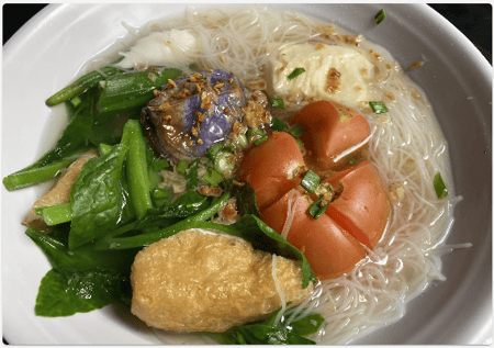 私はノーマルなスープに、細いビーフン麺、生のトマトや揚げナスなど、6種類の具材を選びました。具材は6個以上入れるのが、お店のルールです。